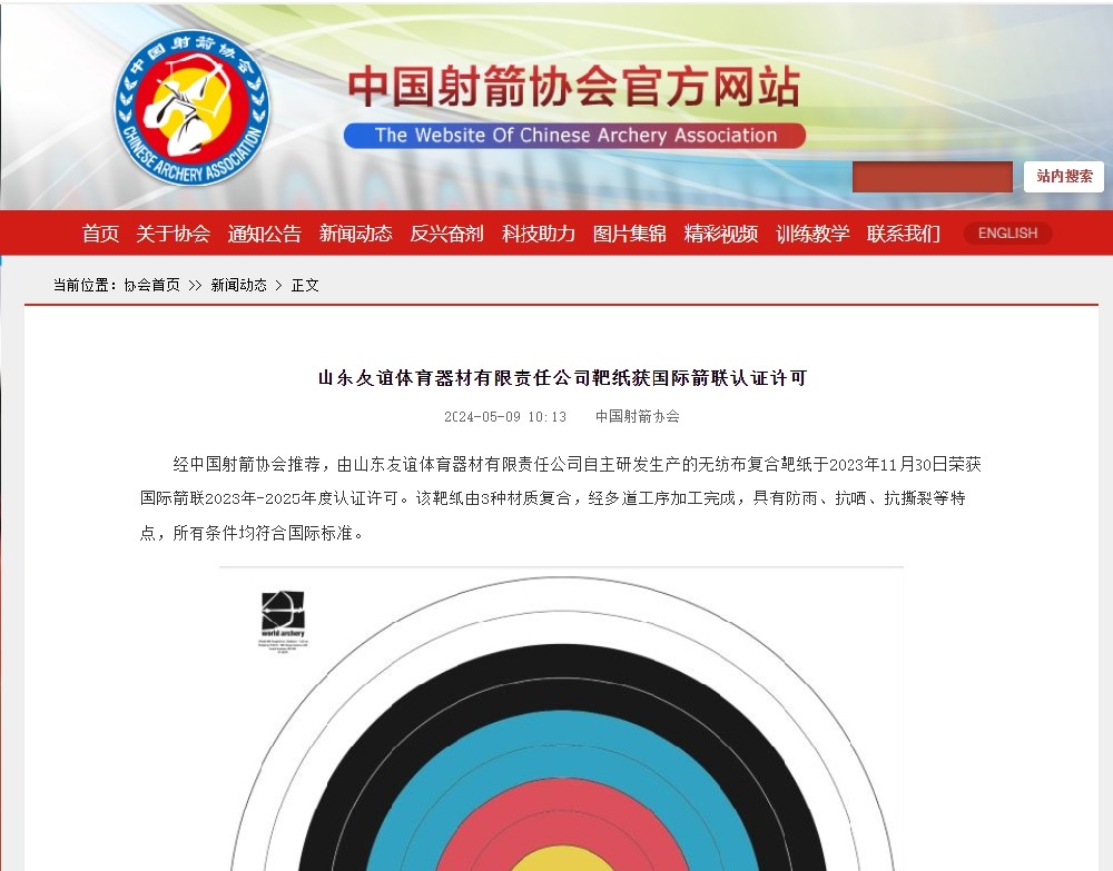 目前,主要生產(chǎn)和銷售射箭比賽及訓(xùn)練專用器材,包括:箭靶、靶紙、靶架、號碼牌、風(fēng)向旗、計(jì)時記分器等場地器材設(shè)備;反曲弓、復(fù)合弓、傳統(tǒng)弓、瞄準(zhǔn)器、防震桿等弓箭裝備;箭壺、護(hù)胸、護(hù)臂、護(hù)指等各類箱包護(hù)具。公司所生產(chǎn)的射箭器材已通過國際射箭聯(lián)合會及中國射箭協(xié)會CAA認(rèn)證。